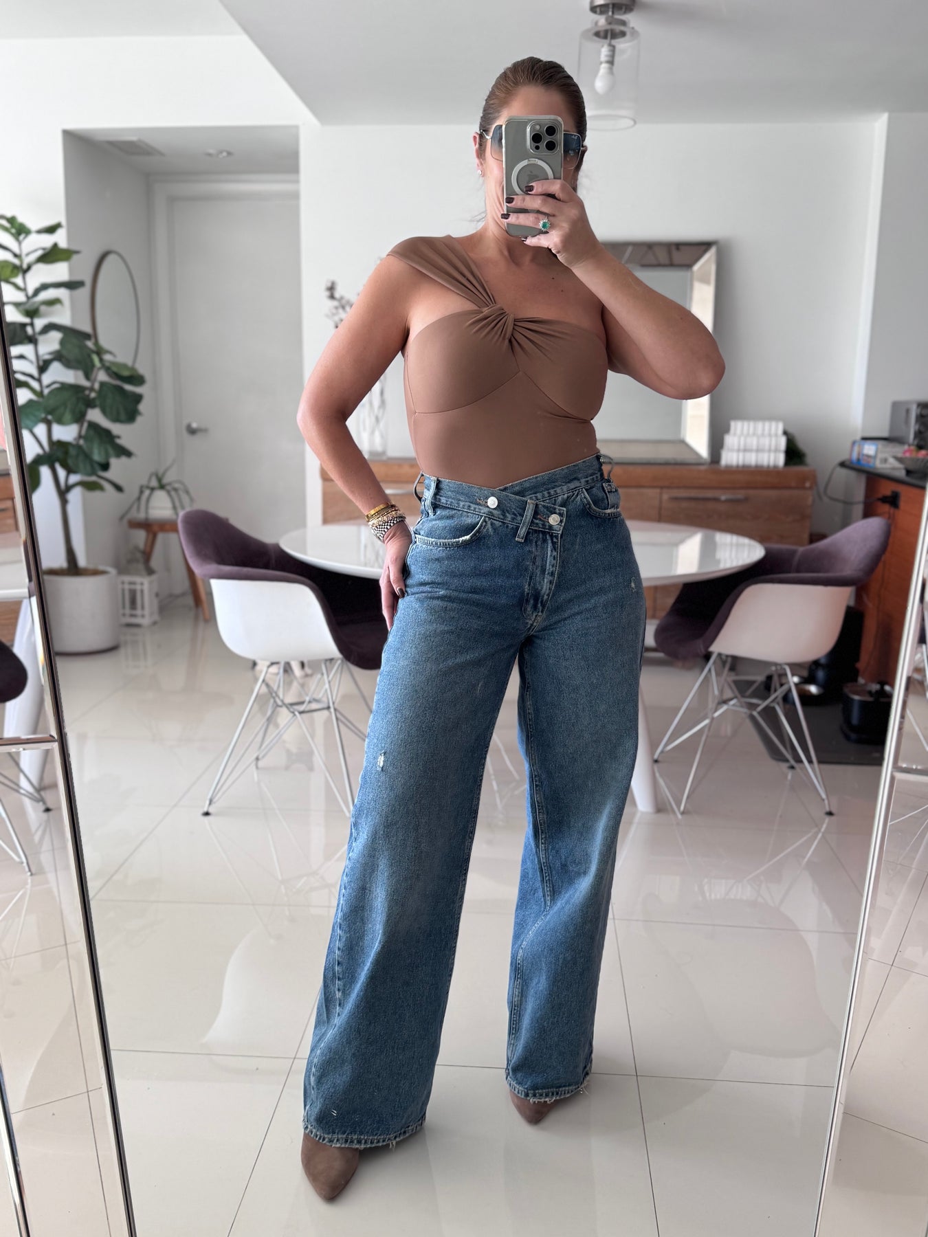 High-rise wide-leg denim pants featuring a modern crossed waistband for a flattering, statement fit. No streching!